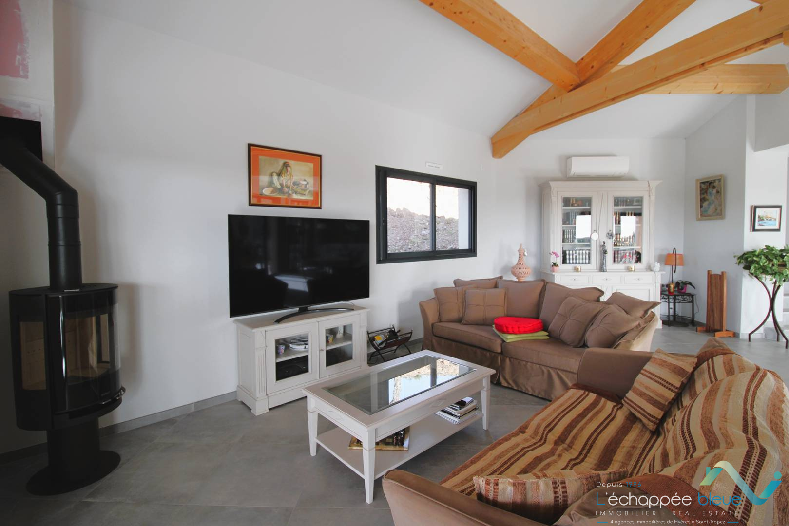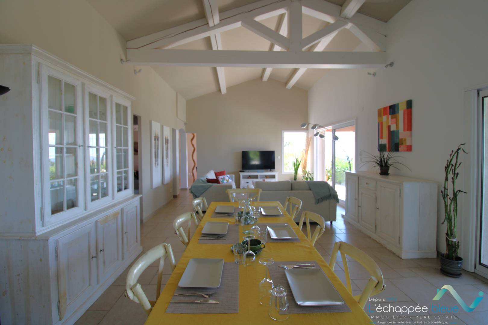 Au sein d'un domaine sécurisé, cette villa très spacieuse jouit d'une position dominante offrant une vue panoramique dégagée sur les vignobles, la baie de Hyères, les Îles d'Or et les collines environnantes. Calme et confort à quelques minutes des magnifiques plages de sable fin de l'Argentière, l'Estagnol, Brégançon et Pellegrin et de...