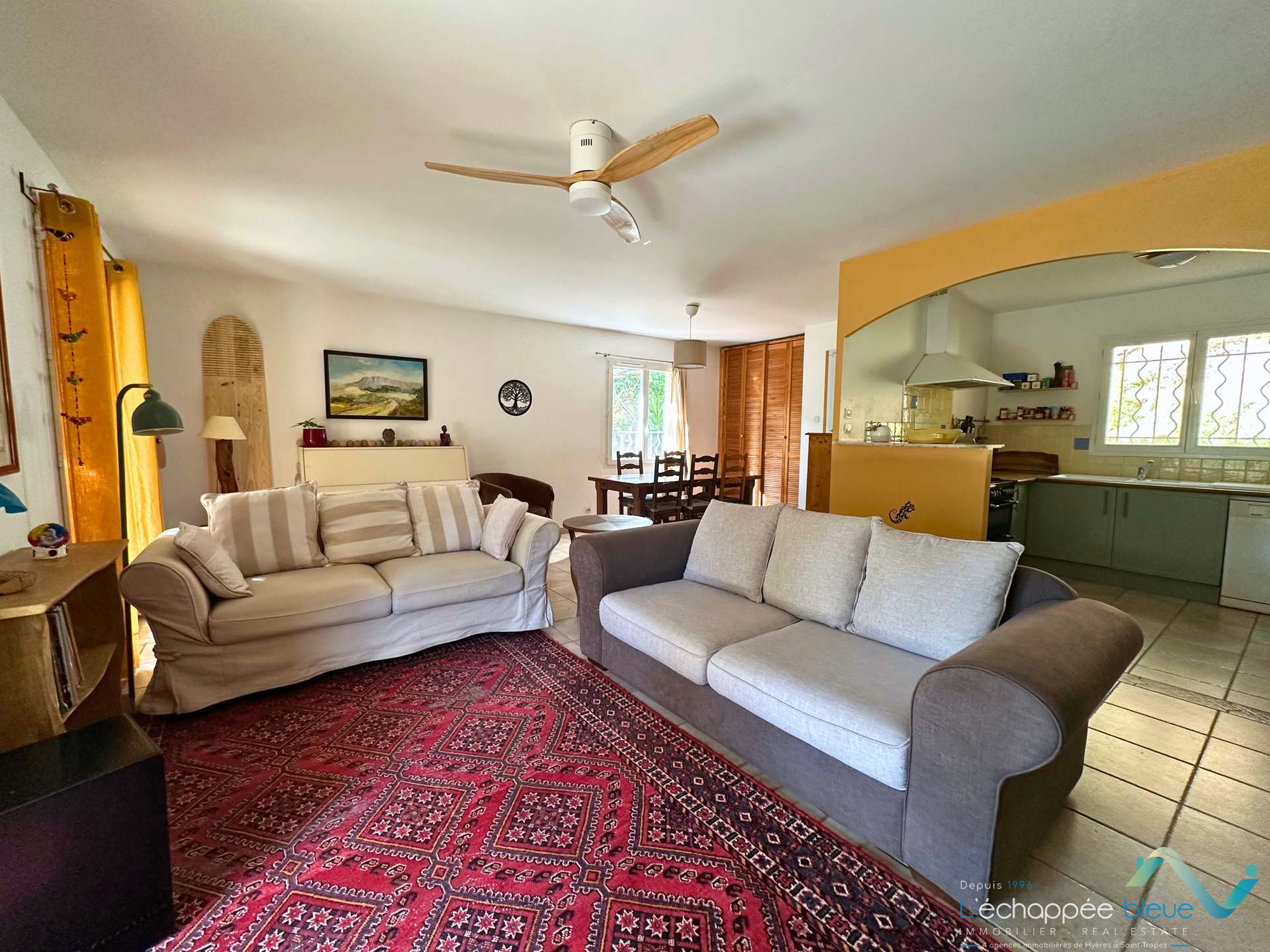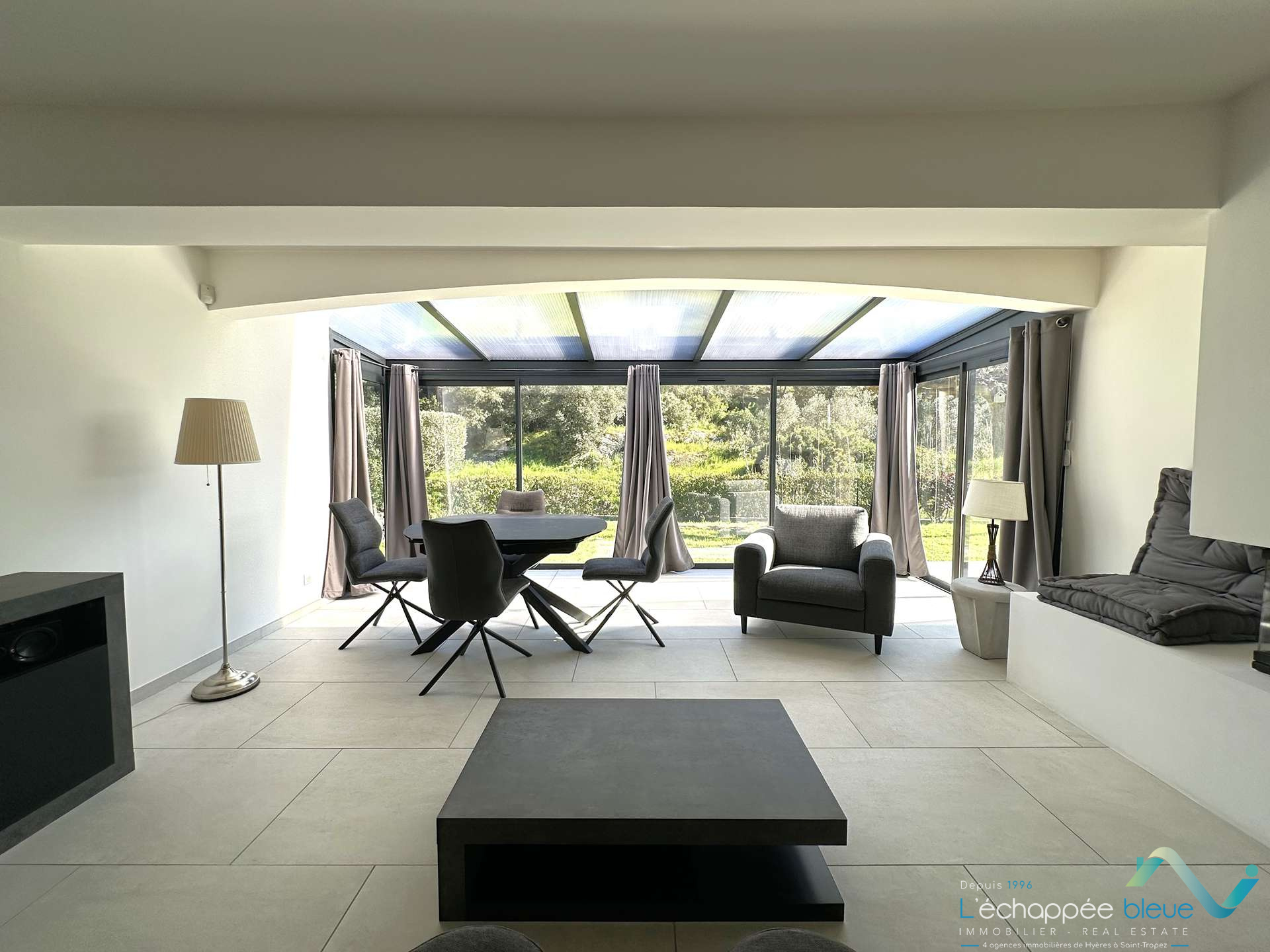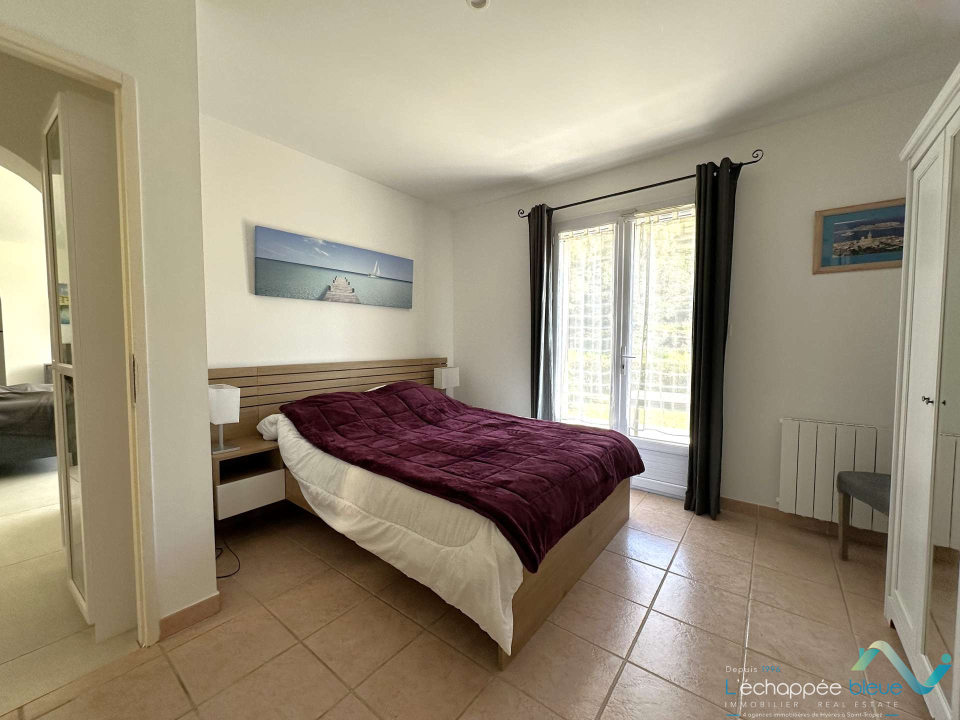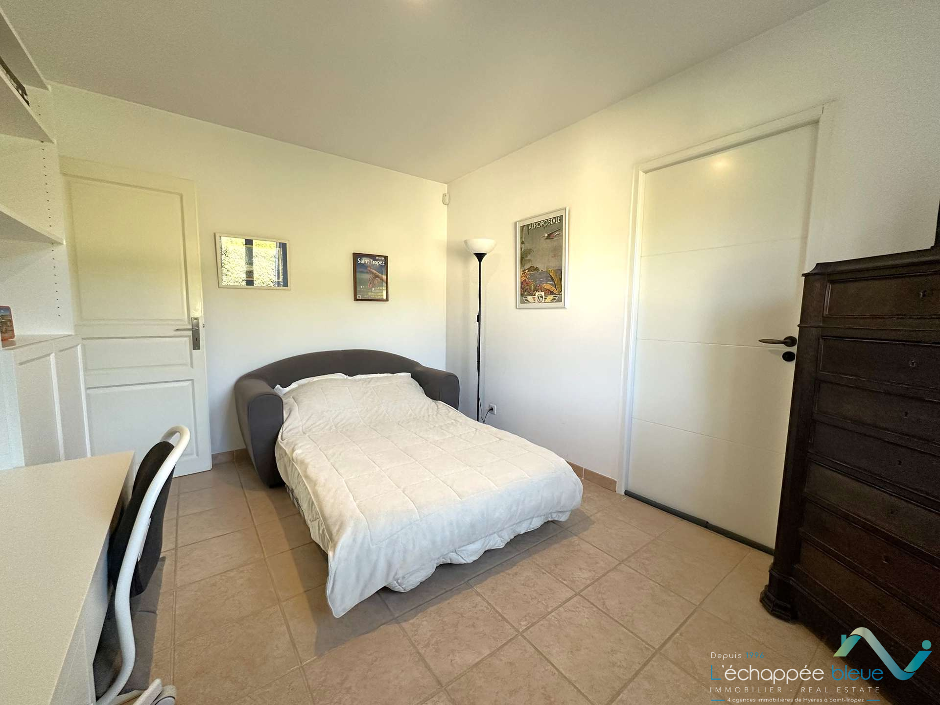 Au sein d'un domaine sécurisé, cette villa très spacieuse jouit d'une position dominante offrant une vue dégagée sur les vignobles, la baie de Hyères, les Îles d'Or et les collines environnantes. Calme et confort à quelques minutes des magnifiques plages de sable fin de l'Argentière, l'Estagnol, Brégançon et Pellegrin et de l'embarcadère pour...