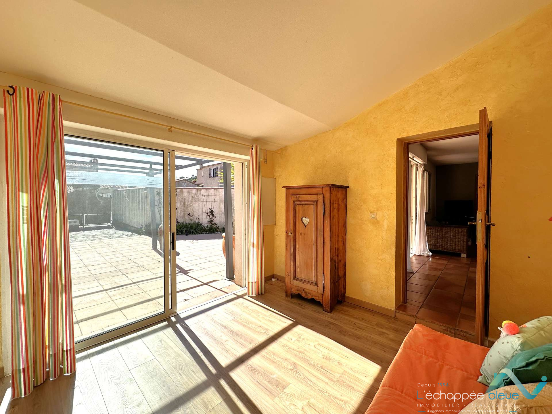 Au sein d'un lotissement privé, édifié sur l’une des collines du Domaine de Valcros. La résidence est composée de petites maisons, pour la plupart jumelées. L'ensemble arboré et fleuri, avec placettes et escaliers a l’allure d’un village aux nombreux chemins piétonniers serpentant dans un jardin méditerranéen. La maisonnette mitoyenne a été...